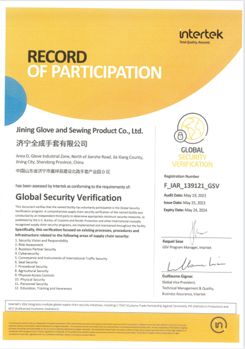 熱烈祝賀濟寧全成手套有限公司通過天祥審核獲得 美國生產鏈安全評審合格證書